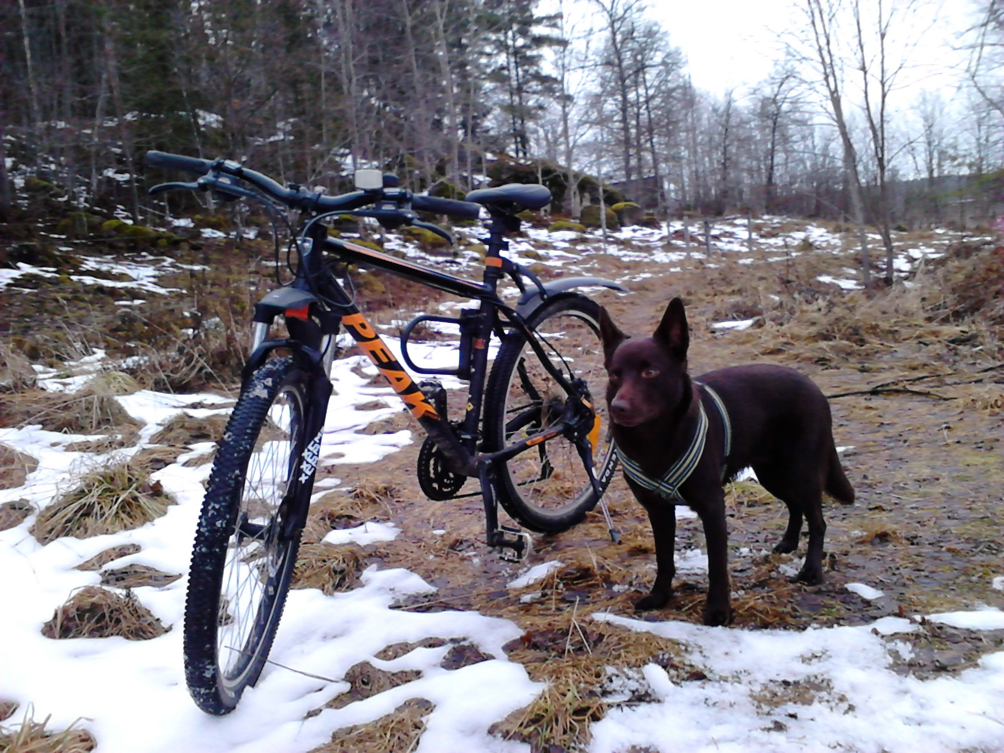 Innan vi cyklade gick vi ett kort spår som jag lagt på ödetomten två timmar tdigare. Det var svårt tyckte Kiro som hade lite svårt att fästa först och sen att struntade i en pinne och missade en spetsvinkel men jag är nöjd med hur han jobbade ändå. Han var lugn och koncentrerad och han markerade båda naturpinnarna.