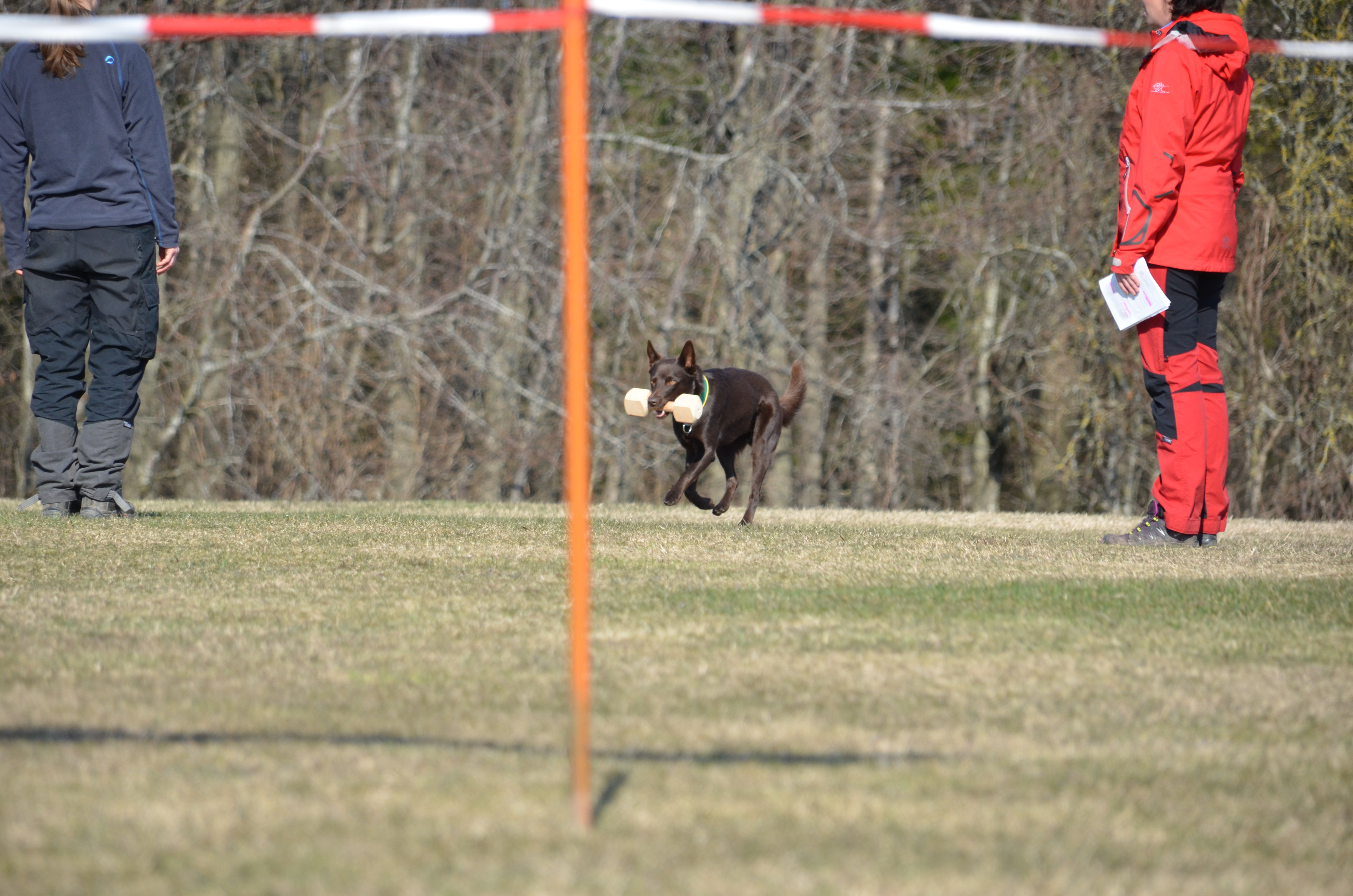 Apportering: 8,5 (Lite tveksamhet vid upptag, lite tempvxl, håller fast lite) Det började bra han satt stadigt när jag kastade, sen kom han fram höll han på att plocka upp apporten från vänster sida men ångrade sig och tog den från höger sida som han brukar göra istället. Farten in kunde ha varit bättre men ändå en förbättring för oss. Sen vid släppandet så var jag otydlig i mitt kommando och då släppte han inte precis som vi tränat så jag fick kommendera igen.
