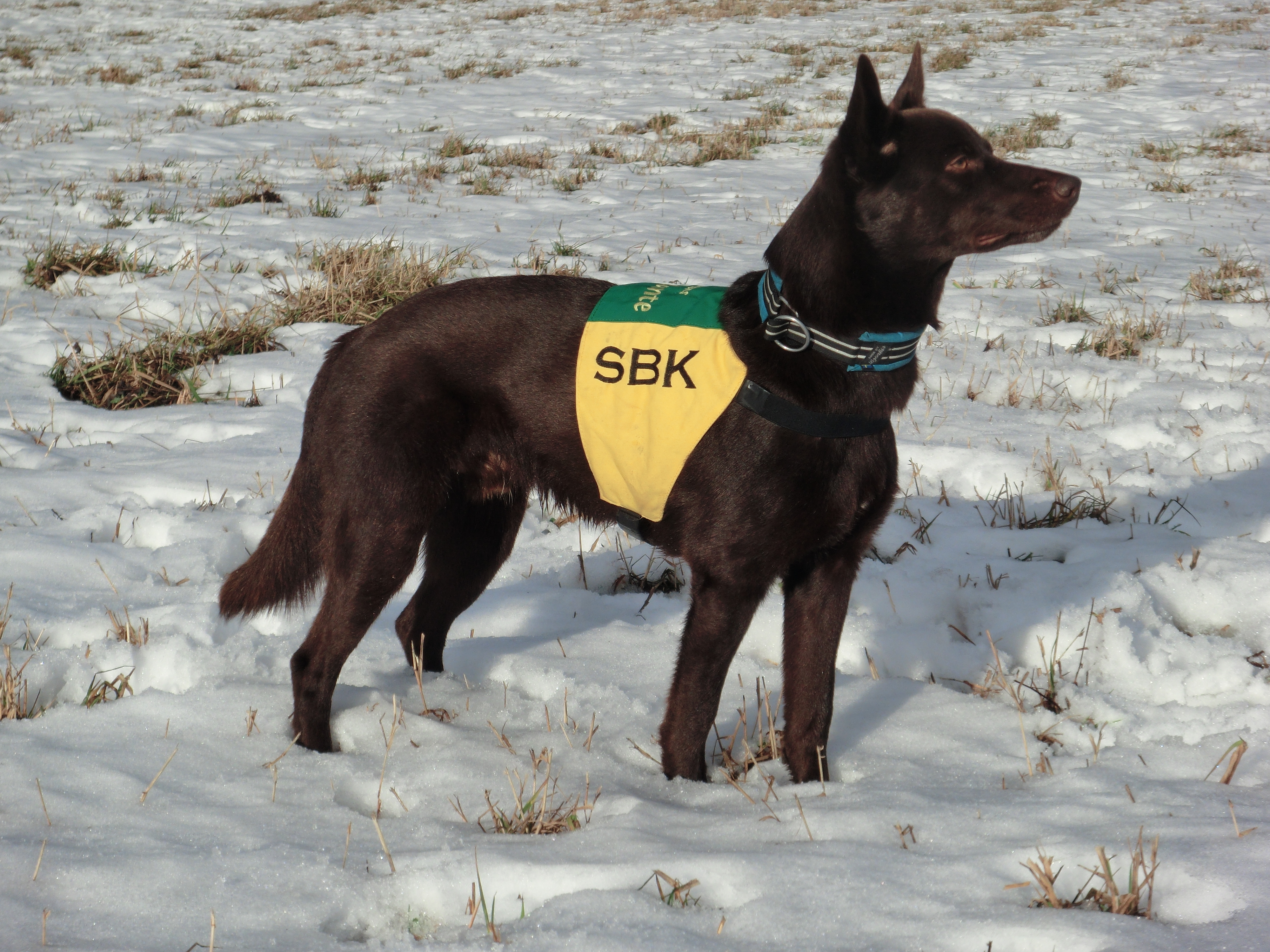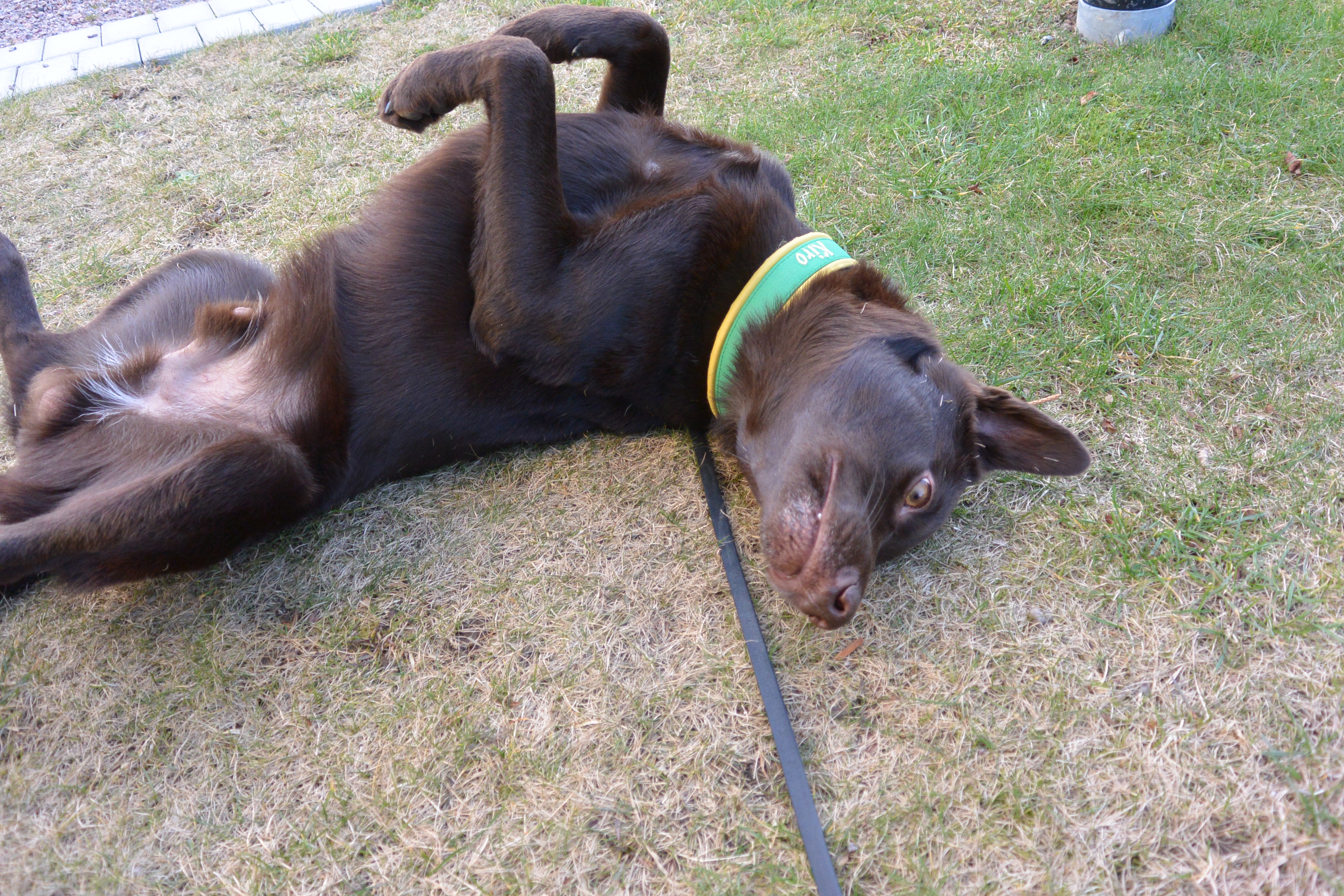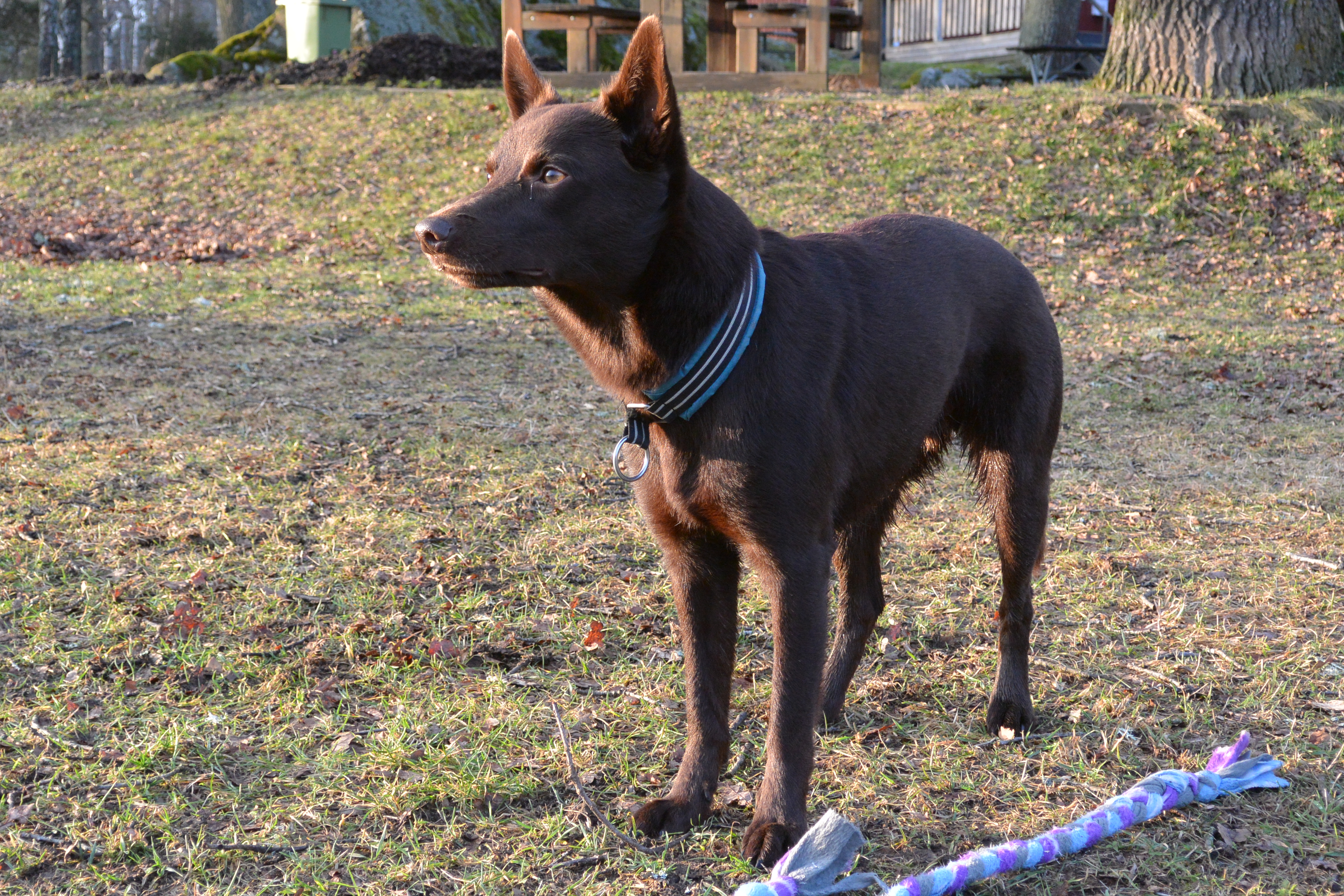 I lydnaden så experimenterade jag lite med olika lekar för att lära Kiro att springa fort in till mig med olika föremål. Det vi provade som jag tror mest på var att lägga ett par olika föremål på ett ställe och sen gå iväg en bit och leka intensivt och när jag avbryter leken så får han springa iväg och hämta ett föremål för att få leka igen. Idag startade jag leken så fort han var på väg tillbaka med ett föremål i full fart. Fortfarande lite svårt för honom att släppa spårpinnar och apportbockar, en leksak släppte han dock halvvägs tillbaka??? Jag misstänker att han lärt sig ”håll fast” träningen lite väl bra med dessa ”svårsläppta” föremål. Jag funderade även lite på att han måste göra skillnad på apportering och uppletade då han i uppletandet inte har några problem med farten in och släpper (tyvärr) föremålen väldigt lätt när jag tar fram belöning. Men då har jag sällan bett honom göra en ingång med föremålet vid uppletande just för att det hade lite samma effekt som i apporteringen dvs. farten in blev sämre. Vi får fortsätta med jobbet att belöna upp ingångarna och sen försöka pussla ihop det men bra fart in.