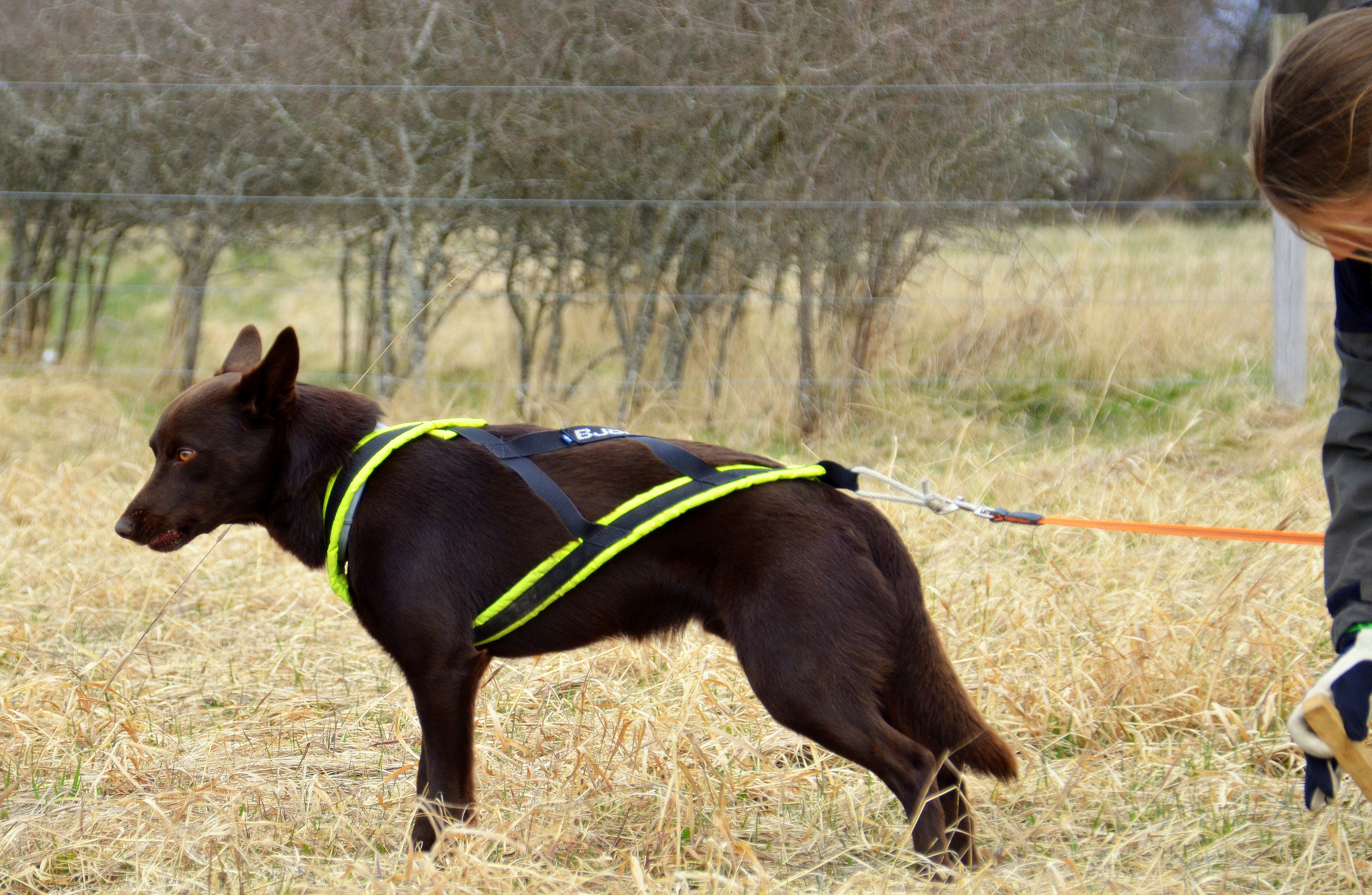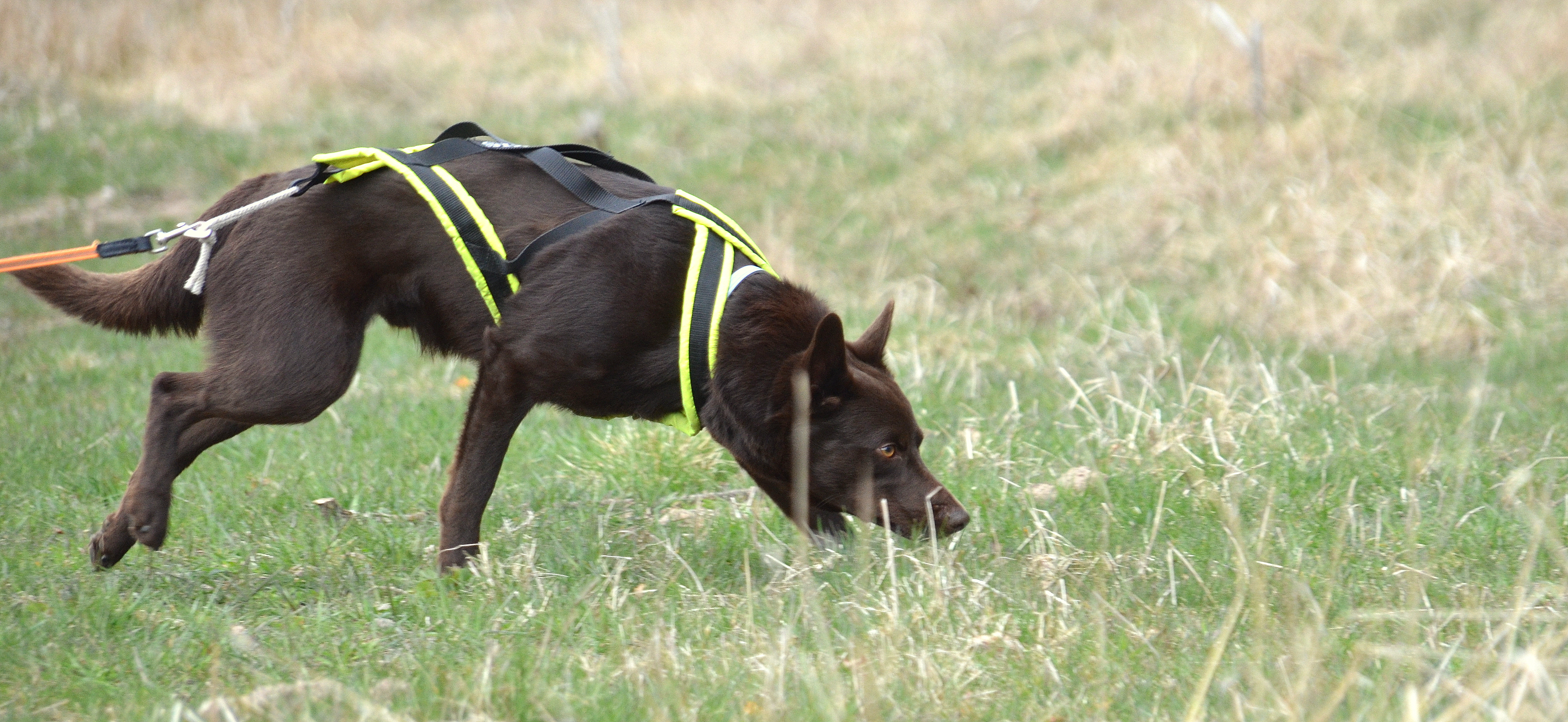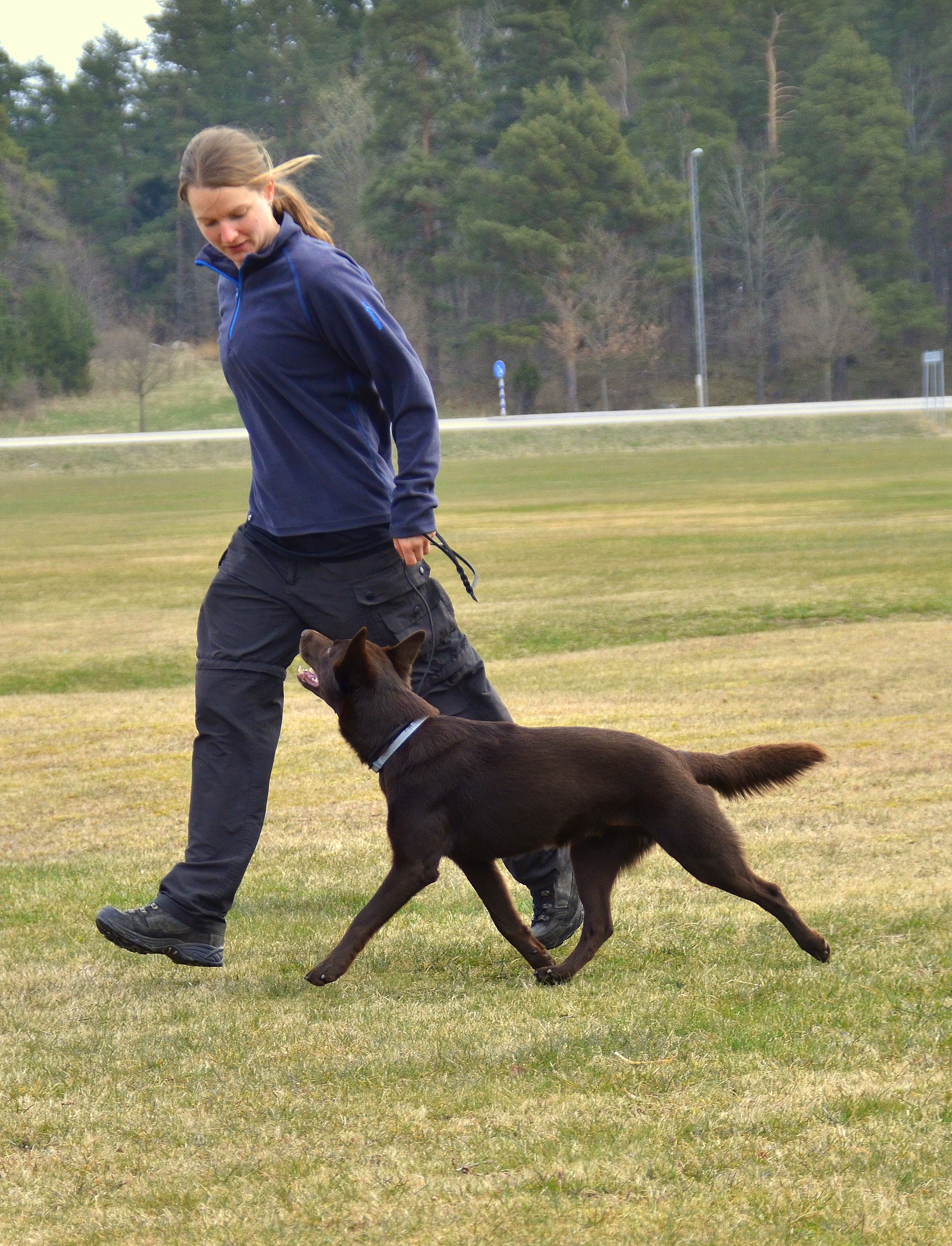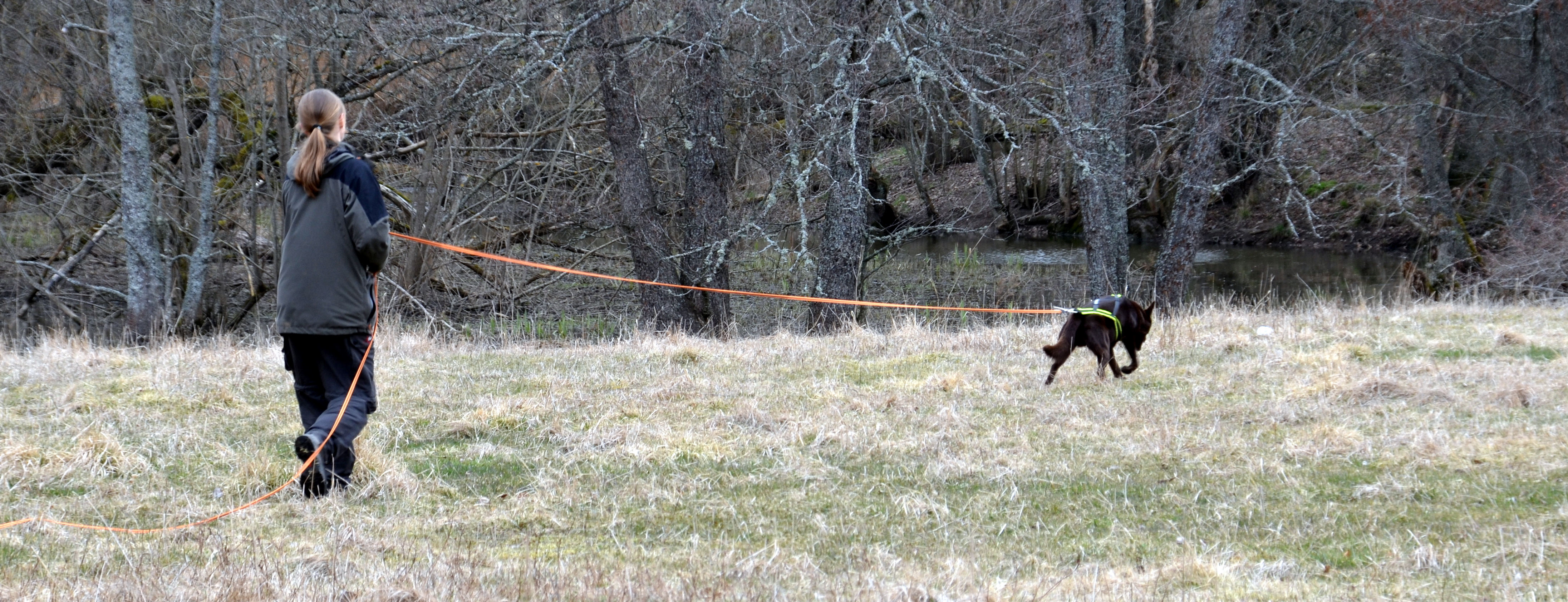 Sen var det dags att spåra. Två spår blev det. Ett längre jag hade lagt i en hage. Jag mätte inte hur långt men uppskattningsvis 800-1000m. 8 föremål och en liggtid på ca 1h. Kiro spårade jättefint. Missade eller struntade i en tygbit dock men jag såg den så tog jag upp och visade den så lekte vi lite med den ändå. Sen hade husse lagt en kort spår på ca 150 m med en spetsvinkel och idag tog han vinkeln 🙂 kollade av lite åt andra hållet först och stannade sedan upp precis i vinkeln, funderade en kort sekund och spårade sedan vidare. Inga problem med motivationen trots att han var trött efter det första långa spåret.