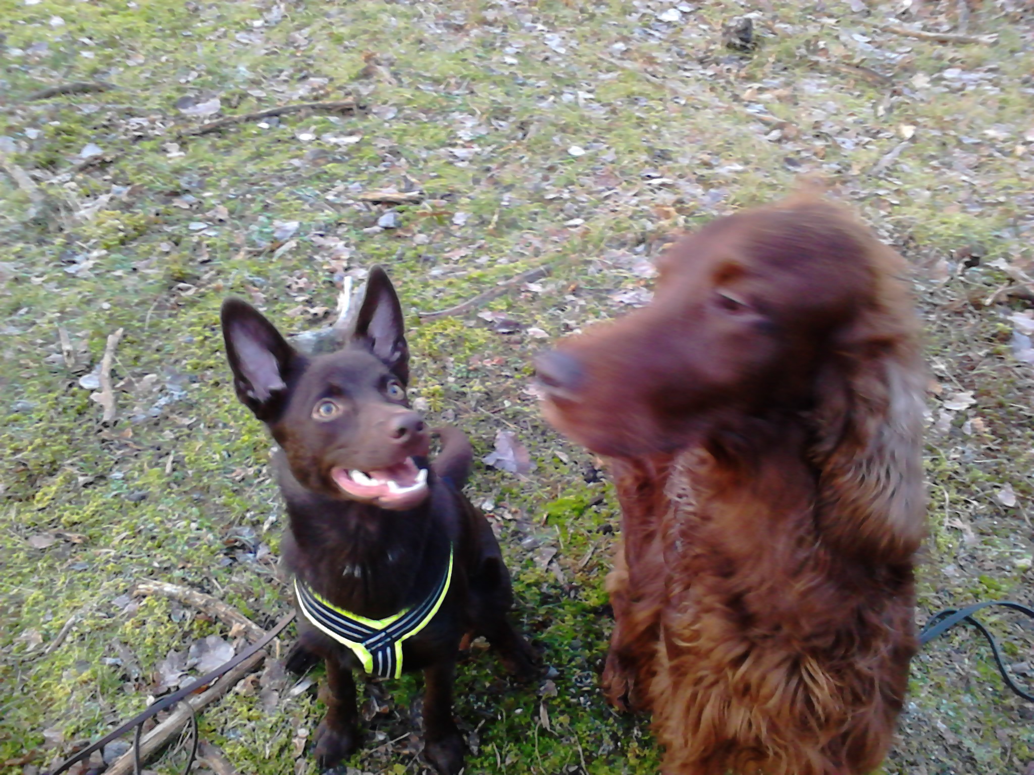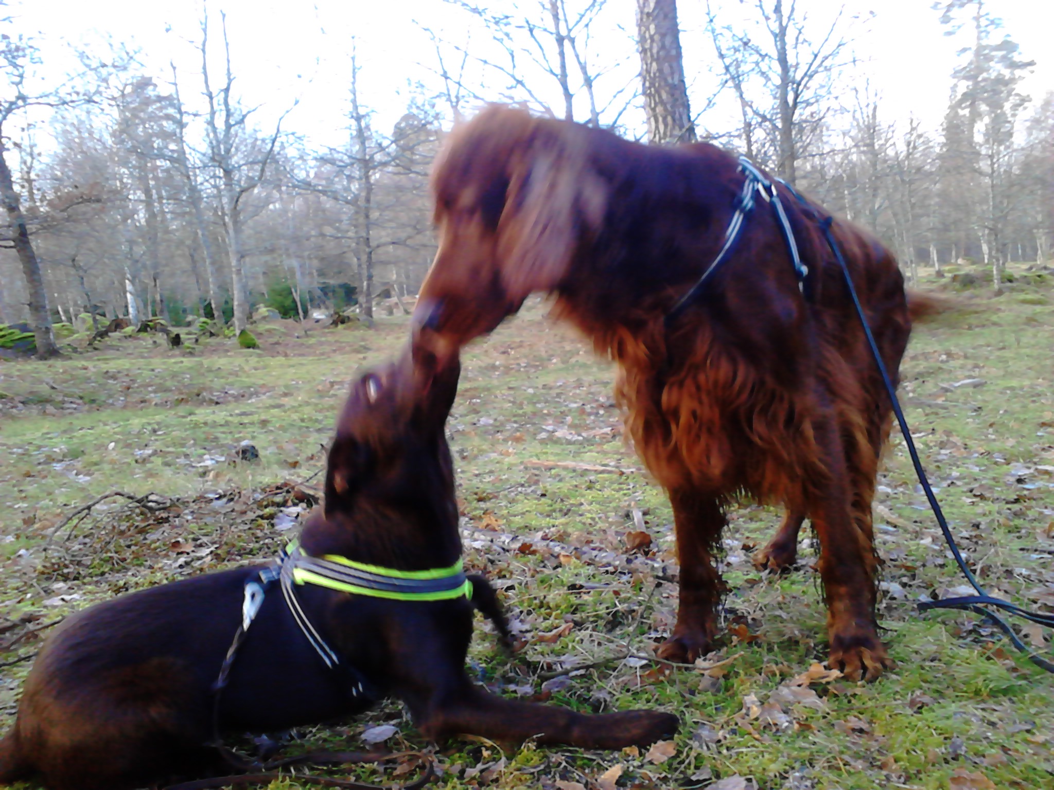 Idag på fm fick hundarna gå en varsin promenad. Helix fick gå på promenad och busa med settern Riley. Har tyvärr varit lite dålig på att låta honom umgås och leka med andra hundar men det gick bra ändå när han väl kom över det värsta fjäskstadiet där han nästan lyckades ta slut på tålmodiga Rileys tålamod med sitt slickande. Men sen sprang de och lekte en stund. Sen ville han inte gå hem, det var ju såååå kul att leka med Riley. Sen fick Kiro en promenad med bara matte och husse, så lycklig, lite budföring blev det också. Helix fick träna på att vara helt själv hemma vilket inte var några som helst problem, skönt.
