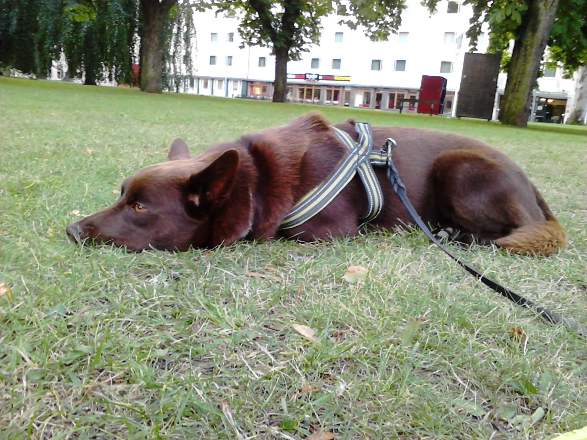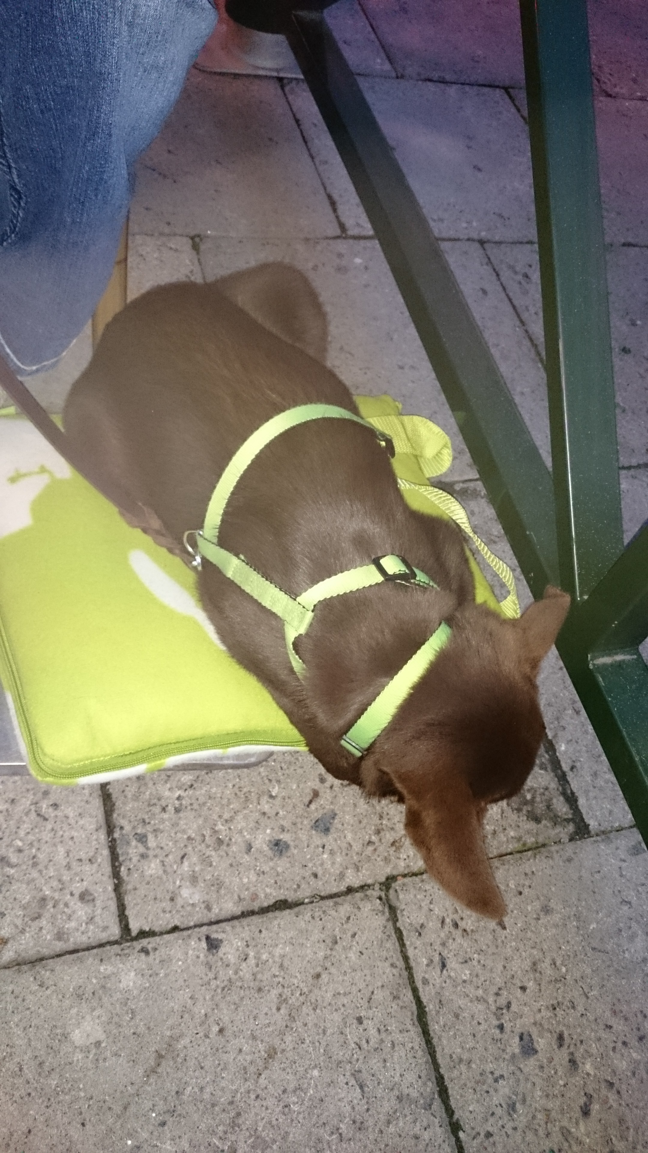 Vi har lite att träna på. Men sen när vi gick och åt på en uteservering så låg han och sov som en klubbad säl trots att det rörde sig mycket folk väldigt nära 🙂