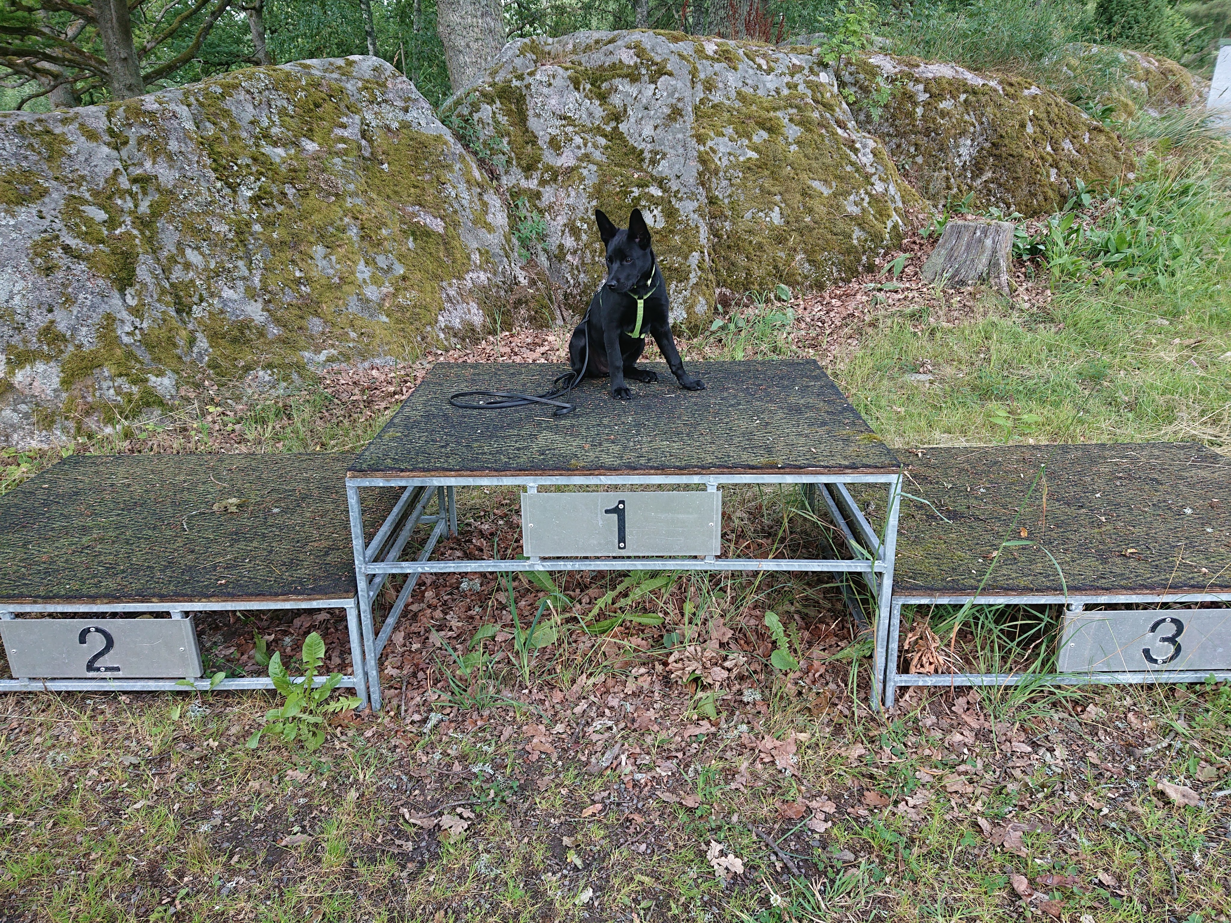 Sen funderade jag på att bryta och åka hem men bestämde sen att köra lydnad och platsliggning som träning. Vi avstod framförgåendet och bröt innan uppletandet. Lydanden gick väldigt blandat. Kasst fotgående, bara en massa gnäll och fokustapp. Han vet nog helt ärligt inte vad som förväntas av honom i det momentet. Där har vi massor av träning att göra. Inkallning gick ok, lite dålig fart första sträckan bara men han stannade. Krypet gick ok, lite ojämnt tempo och han satte sig i halten och något gnäll. Liten tjuvstart i skallet samt lättade med framtassarna. Superapporteringar. Fick en 10:a av ena domaren på metallen. Ok hopp över hinder lite startljud och lite segt sättande. Bråttom över stegen.