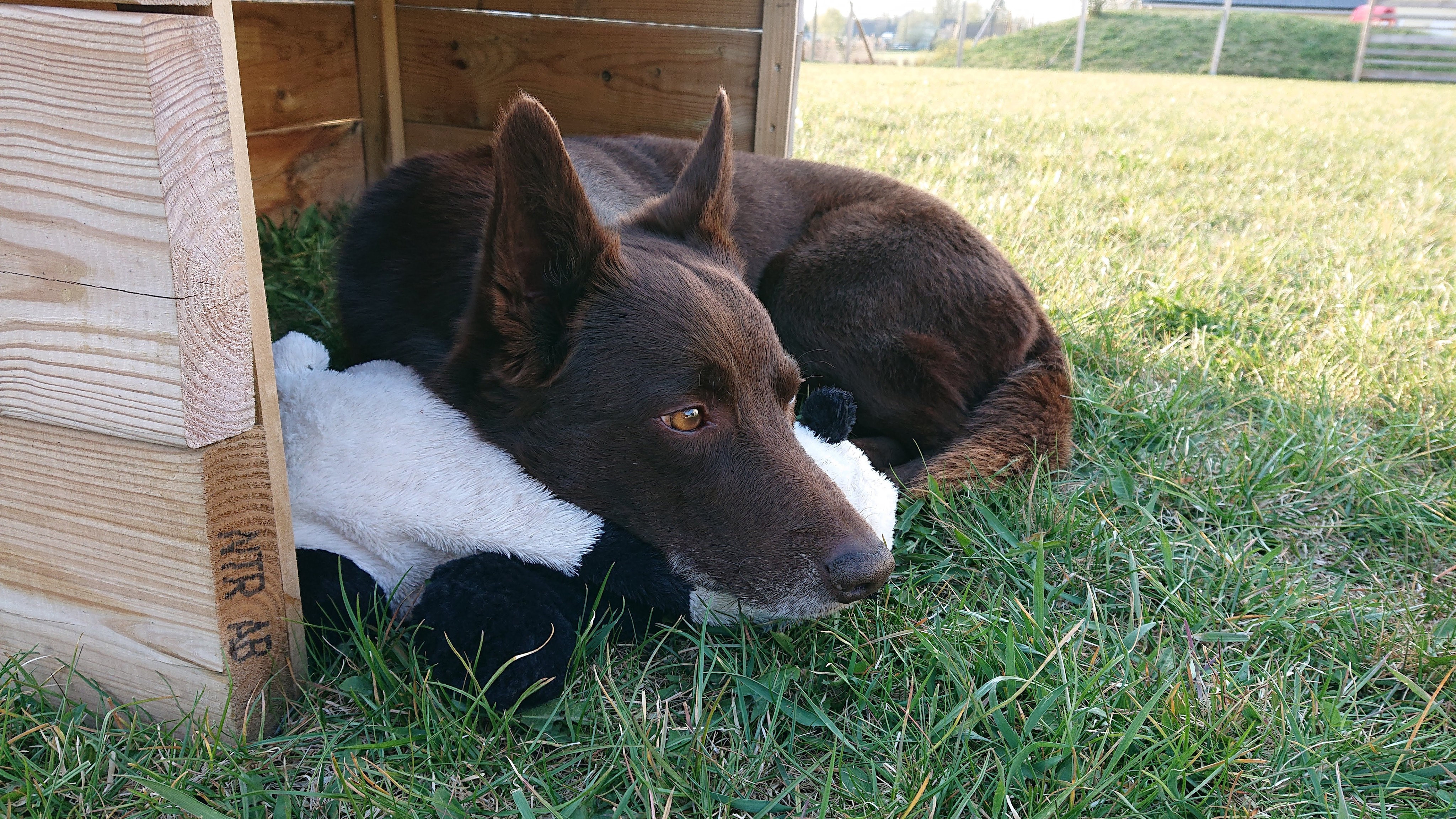 Kiro på en favoritplats med ett omtyckt gosedjur